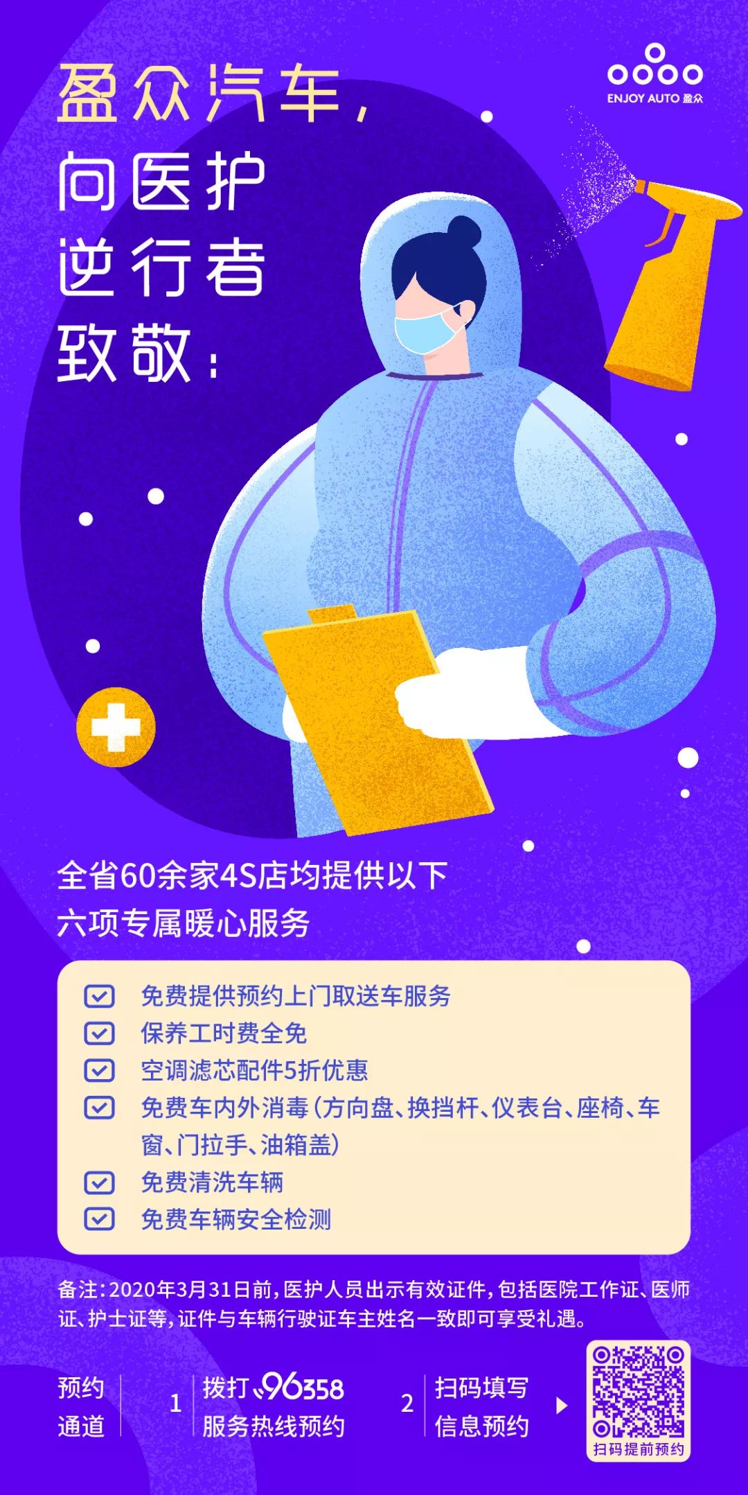 盈眾全省60余家4S店為醫(yī)護人員提供六項專屬暖心服務,2020年3月31日前,醫(yī)護人員可通過以下兩種方式進行預約——