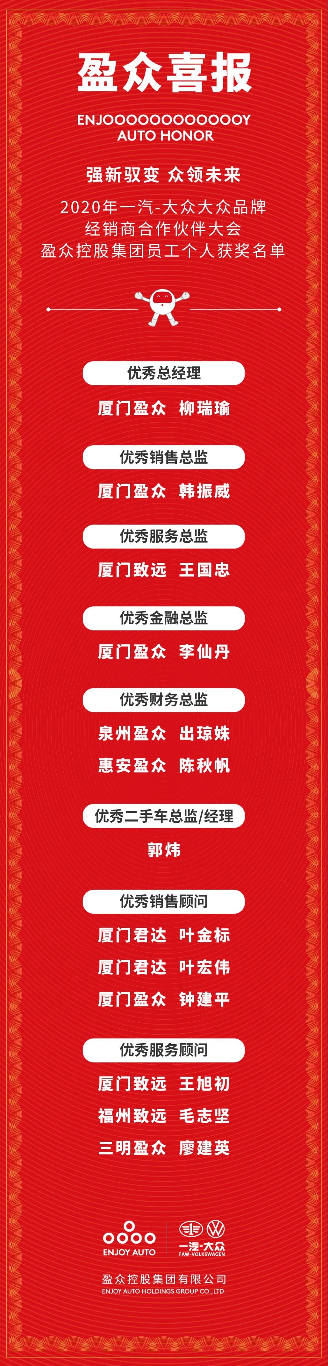 在這場一年一度的一汽-大眾年度盛會上,盈眾控股集團憑借2020年出眾的銷售業(yè)績、高標準的服務水平以及優(yōu)秀的企業(yè)經(jīng)營能力,再度榮獲功勛經(jīng)銷商集團、五星經(jīng)銷商等大獎。其中,廈門盈眾已連續(xù)12年獲得五星經(jīng)銷商榮譽稱號。泉州盈眾、廈門君達、福州盈眾等多家4S店榮獲星級經(jīng)銷商等榮譽。