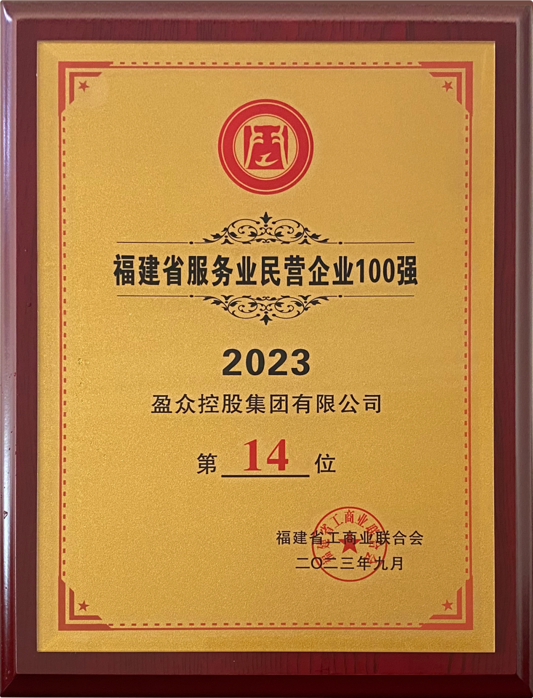 盈眾控股集團(tuán)憑借穩(wěn)健增長的發(fā)展態(tài)勢、優(yōu)秀的經(jīng)營業(yè)績、行業(yè)領(lǐng)先的服務(wù)水平,入選2023“福建民營企業(yè)100強(qiáng)”行列,在參評企業(yè)中排名第45位。并入選“福建省服務(wù)業(yè)民營企業(yè)100強(qiáng)”,在參評企業(yè)中排名第14位。