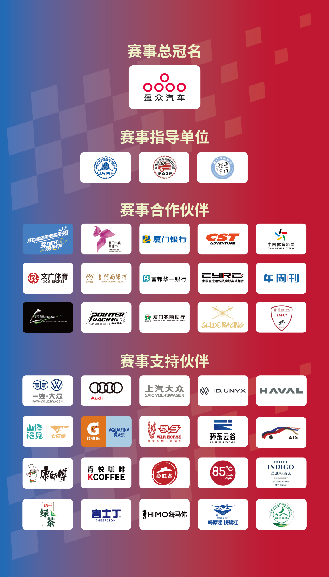 賽事由廈門市翔安區(qū)文化和旅游局、廈門市翔安區(qū)市場監(jiān)督管理局、廈門市翔安區(qū)婦女聯(lián)合會、廈門市翔安區(qū)內(nèi)厝鎮(zhèn)人民政府主辦;由中國汽車摩托車運(yùn)動聯(lián)合會、福建省汽車運(yùn)動聯(lián)合會、廈門市體育局、廈門市翔安區(qū)人民政府共同指導(dǎo);并得到了廈門文廣體育有限公司、廈門市翔安區(qū)文化館、廈門市翔安區(qū)青少年宮、指針賽車、銀驥賽車、中汽賽智(重慶)體育發(fā)展有限公司、廈門市翔安區(qū)吉他協(xié)會、廈門市翔安區(qū)音樂舞蹈協(xié)會、廈門市翔安區(qū)餐飲協(xié)會等單位和團(tuán)體的大力支持。